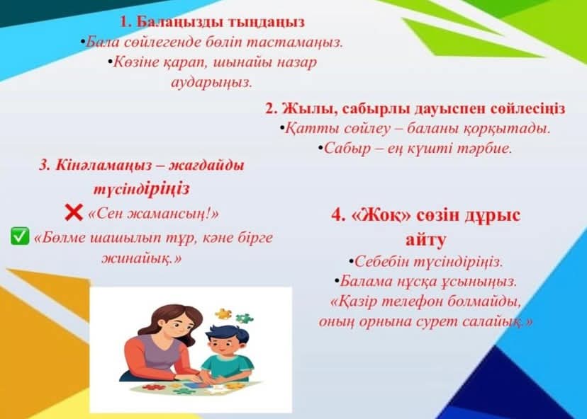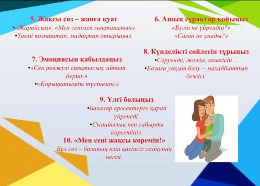 Мақсаты: Мектепке дейінгі жастағы балалардың ата-аналарына тиімді қарым-қатынас құрудың психологиялық әдістерін түсіндіру; бала мен ересек арасындағы өзара түсіністікті нығайту.ф